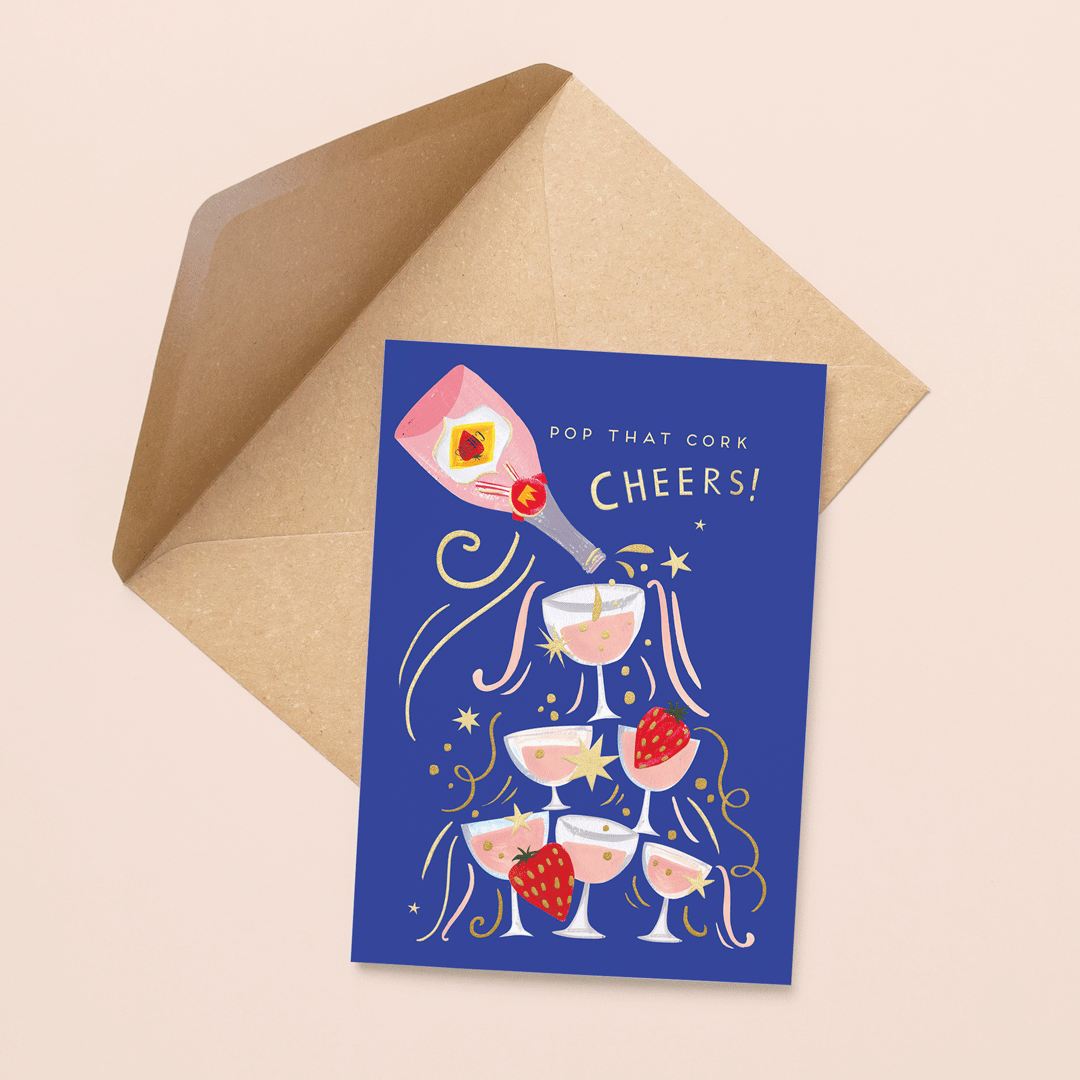 Suitable for multiple occasions this card could be used for Birthdays, Celebrations, Anniversaries, Graduations and many more celebratory occasions! Bubbly being poured into glasses with gold foil finish and royal blue background.