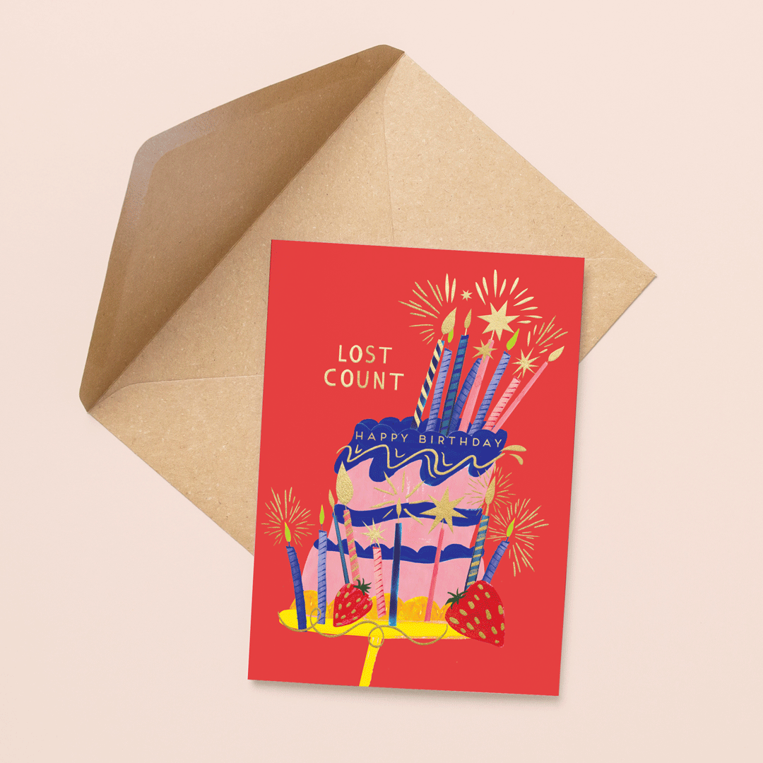 Cheeky illustrated birthday card featuring a wobbly cake. Gold foil finish on an eye-catching red background.
